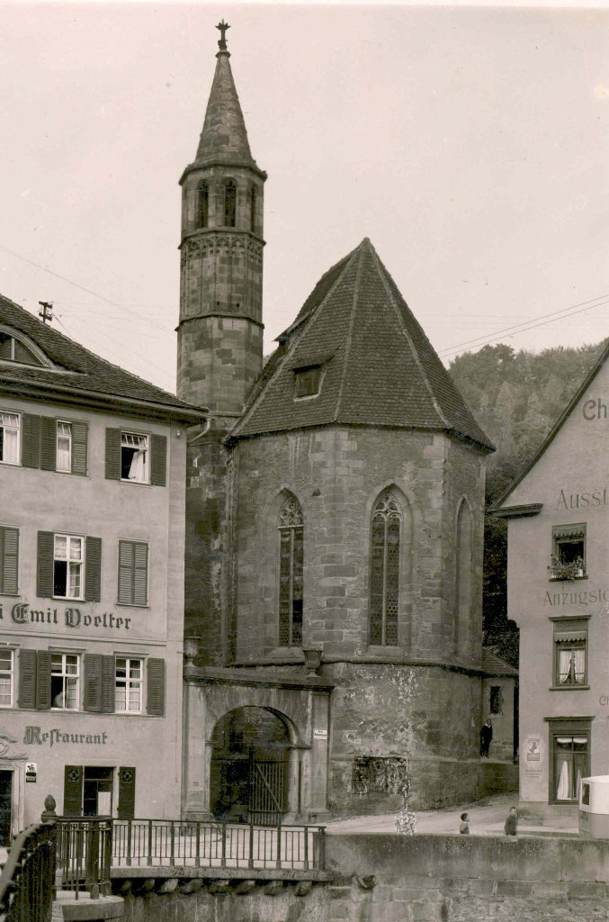 Angaben nach Stadtarchiv SHA 35/2744: Sandsteinspitze im Oktober 1955 wegen Baufälligkeit entfernt, erst im Mai 1961 erneuert.